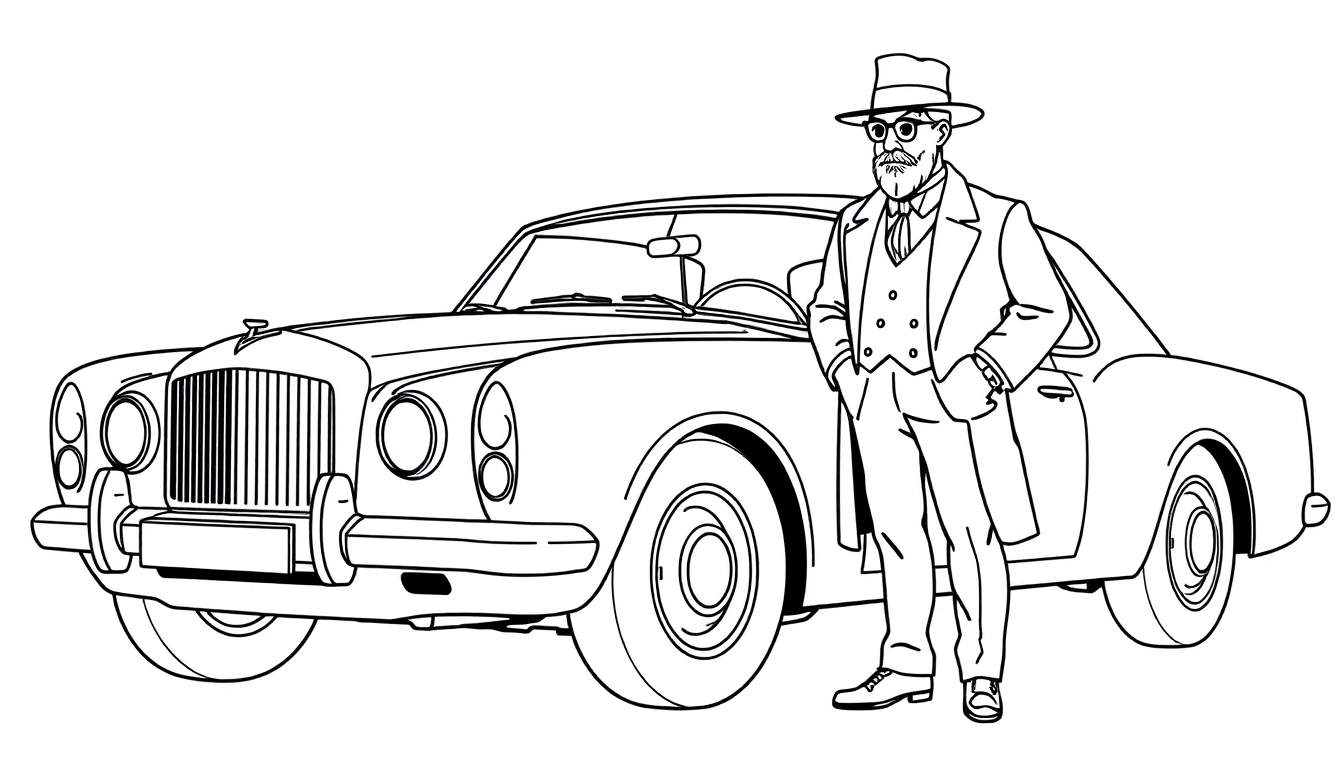 A black and white line drawing coloring page featuring a distinguished gentleman in a three-piece suit standing next to a vintage luxury car, like a Bentley or Rolls-Royce. Perfect for car and classic style enthusiasts.